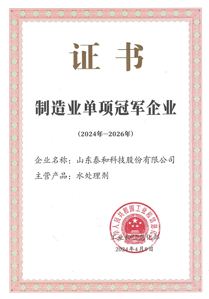 近日,泰和科技領(lǐng)到了國家工業(yè)和信息化部頒發(fā)的“制造業(yè)單項(xiàng)冠軍企業(yè)”證書,代表公司順利通過了復(fù)核。該稱號(hào)的延續(xù)不僅體現(xiàn)了泰和科技在水處理劑制造領(lǐng)域的卓越實(shí)力,也充分展示了公司在市場份額、創(chuàng)新能力、質(zhì)量水平、品牌影響力等方面的顯著優(yōu)勢。